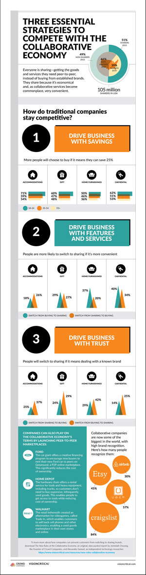 下面列出的信息图表总结了传统品牌在价格、便捷性和品牌这三个方面应如何考虑以与分享型经济竞争。